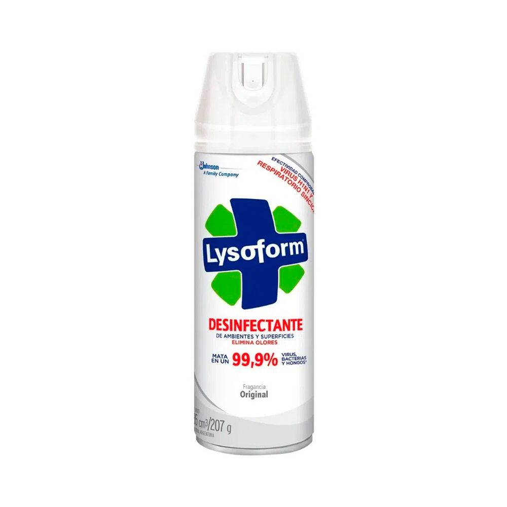 Desinfectante en aerosol Lysoform con fragancia original que mata virus, bacterias y hongos, ofreciendo limpieza profunda y neutralización de olores en ambientes y superficies.