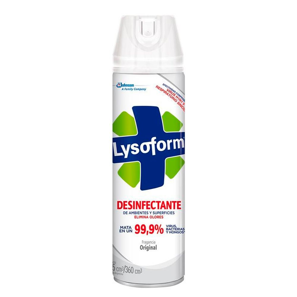 Lysoform aerosol desinfectante con aroma original que actúa eliminando virus, bacterias y hongos del ambiente y superficies, proporcionando una limpieza profunda y aroma fresco duradero.