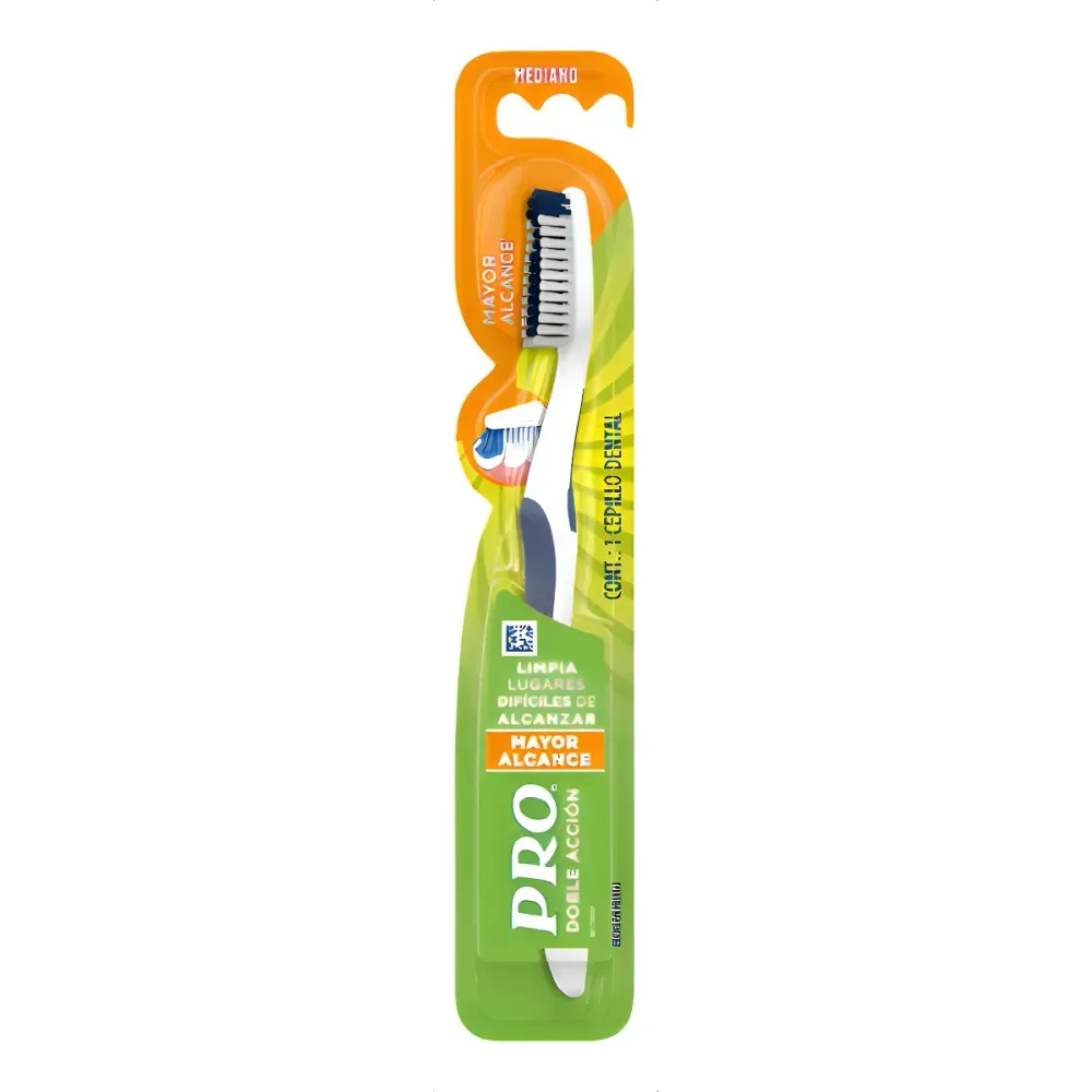Cepillo dental Pro con acción doble, cerdas medianas y cabezal de mayor alcance.