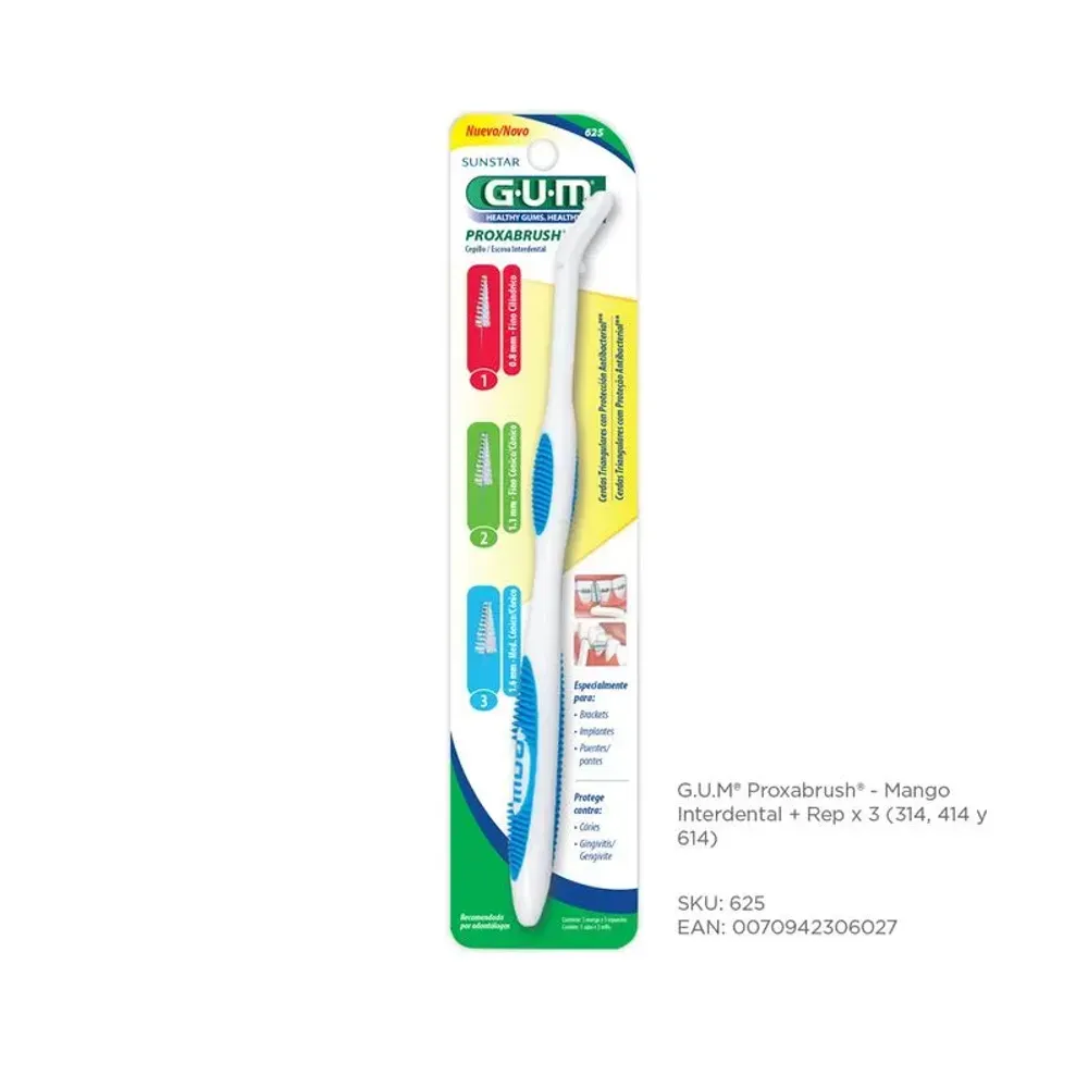 Diseñado para una limpieza interdental eficaz, el cepillo Gum 625 cuenta con un mango cómodo y resistente que facilita el acceso a espacios difíciles entre los dientes. Viene acompañado de repuestos modelos 622 y 624 para reemplazo fácil y duradero.