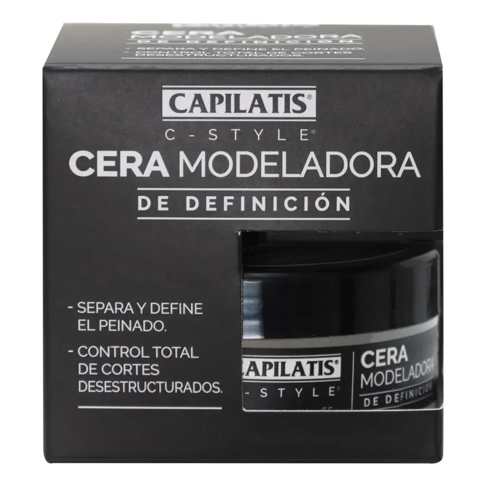 La cera modeladora Capilatis C-Style actúa envolviendo el cabello sin apelmazar, proporcionando una fijación flexible que permite ajustar el peinado durante el día. Su textura facilita un manejo cómodo y un look natural con brillo controlado.