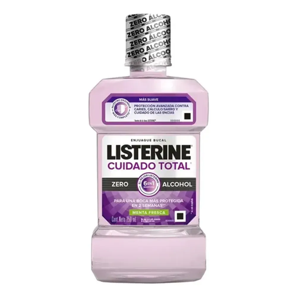 Listerine ofrece un enjuague bucal sin alcohol con eficacia reconocida para el cuidado total de la boca, ayudando a reducir la placa, prevenir gingivitis y controlar el mal aliento sin irritar la mucosa bucal gracias a su fórmula sin alcohol.