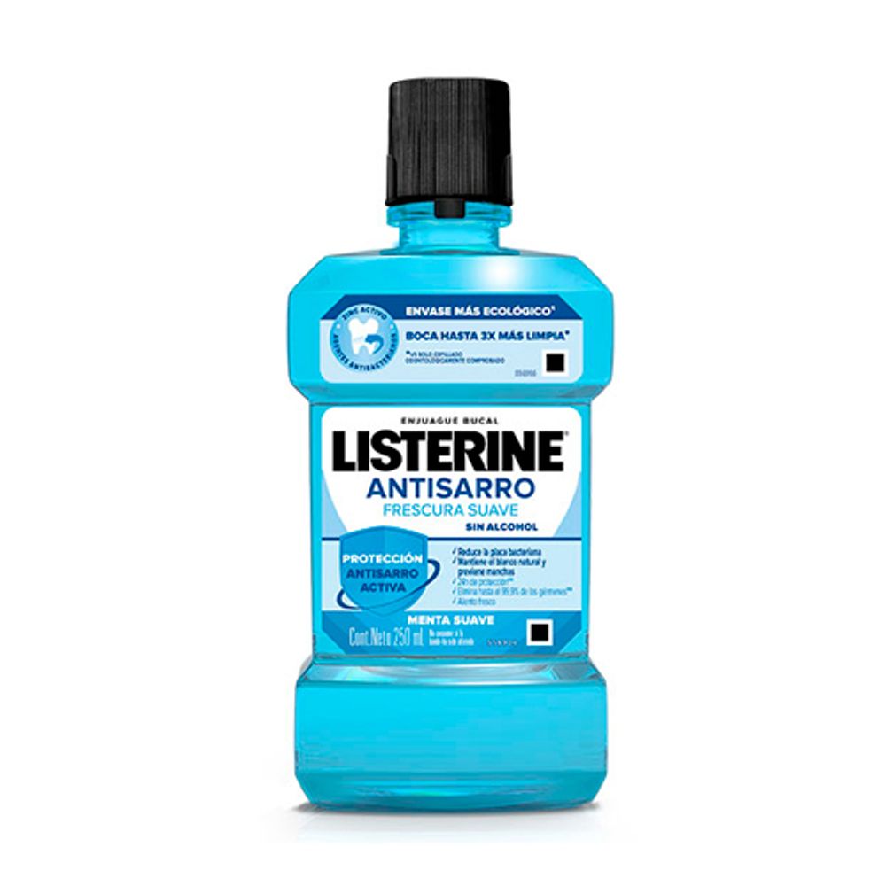 Listerine Control Sarro Zero ayuda a prevenir y controlar la formación de sarro dental, combatiendo los gérmenes que causan mal aliento y placa bacteriana. Su fórmula sin alcohol y sabor suave es ideal para quienes buscan una limpieza efectiva sin la intensidad del alcohol.