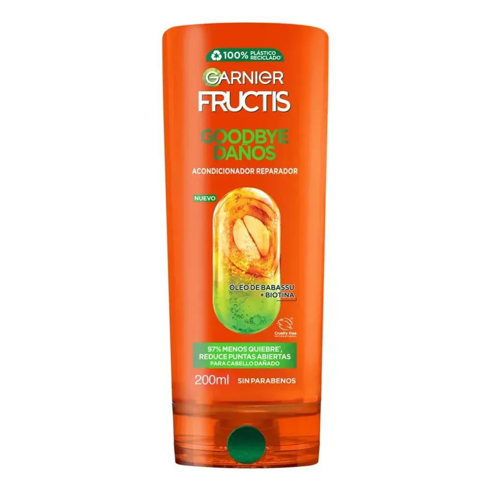 El enjuague capilar Fructis Goodbye Daños está formulado para reparar el cabello dañado y fragilizado. Nutre intensamente y fortalece la fibra capilar, ayudando a reducir puntas abiertas y mejorando la textura y brillo del pelo.