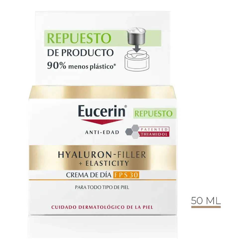 La Crema antiedad de día Eucerin HYALURON-FILLER + Elasticity contiene Ácido Hialurónico que ayuda a rellenar las arrugas. Además, su fórmula contiene dos ingredientes claves como el Thiamidol que reduce las manchas de la piel y previene su reaparición; y el Complejo de Colágeno-Elastina, que favorece la producción natural de colágeno, mejorando la elasticidad de la piel. Contiene FPS 30, no comedogénica y está probada en todo tipo de pieles.