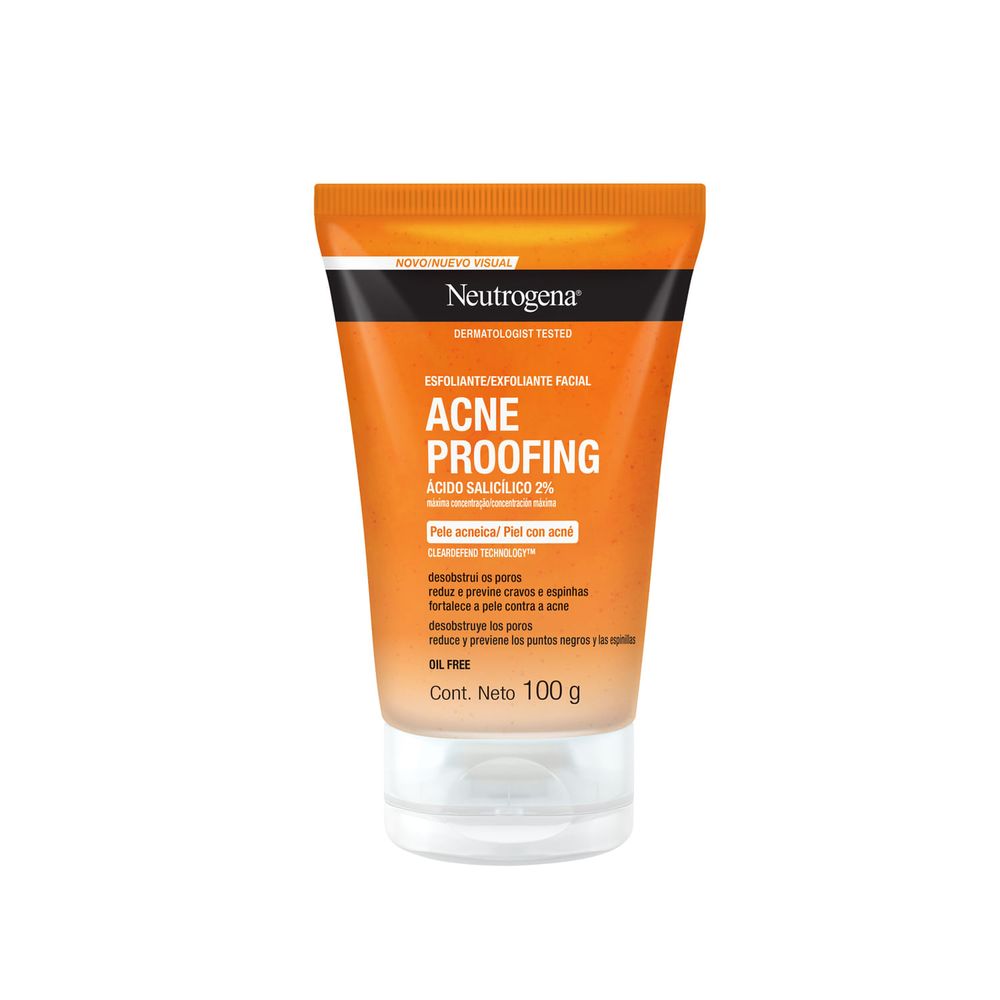 El exfoliante facial Neutrogena Acne Proofing posee una fórmula con microesferas exfoliantes y ácido salicílico que remueve impurezas, desobstruye poros y fortalece la defensa natural de la piel. Recomendado para pieles grasas con tendencia a granitos, ayuda a reducir puntos negros y controlar el exceso de sebo sin resecar la piel.