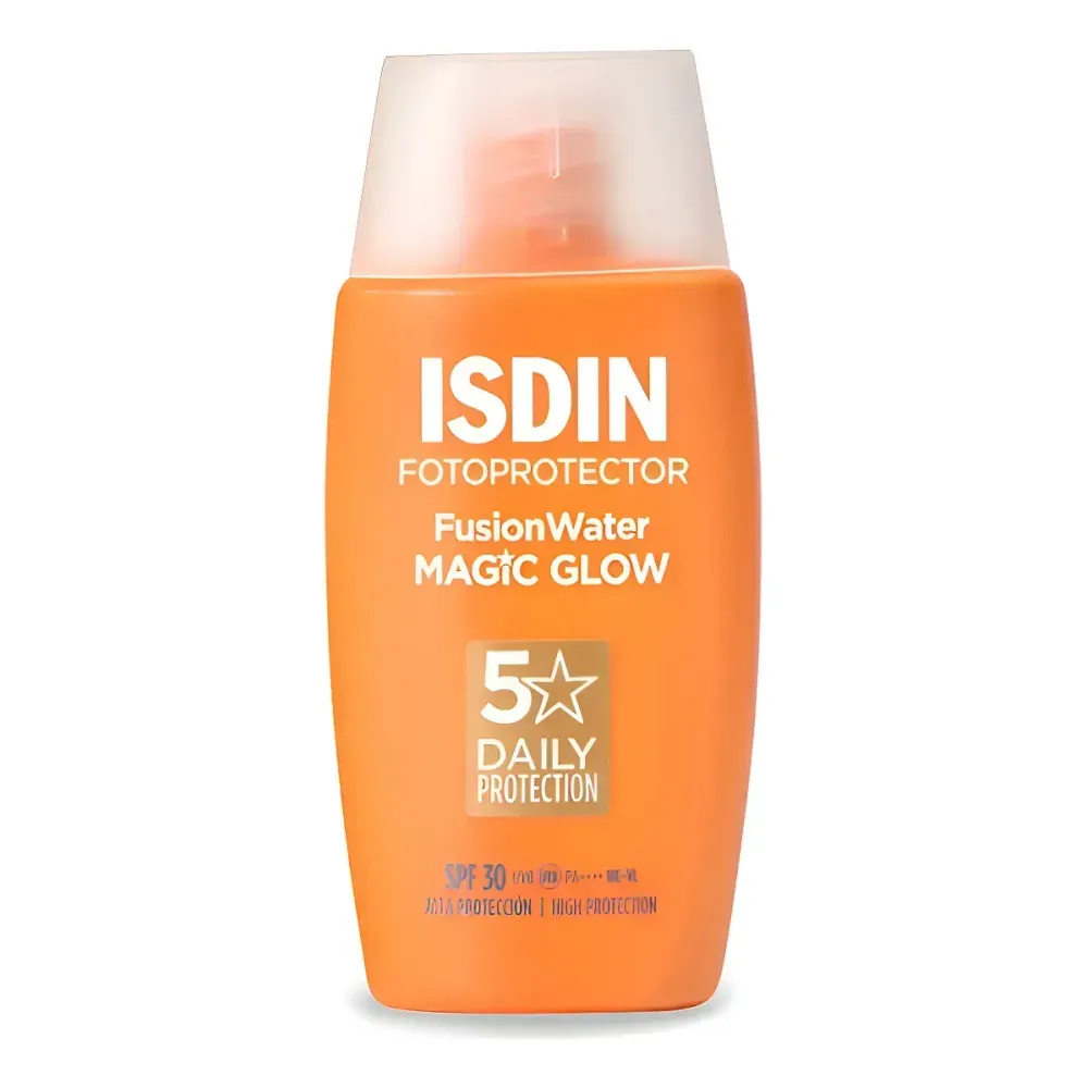 Protector solar facial de textura ultraligera y fase externa acuosa con efecto glow. Protegé tu rostro con Fusion Water MAGIC GLOW SPF 30, el fotoprotector facial ultraligero de absorción inmediata que se funde con la piel. Prolonga el bronceado natural y aporta luminosidad y efecto glow.