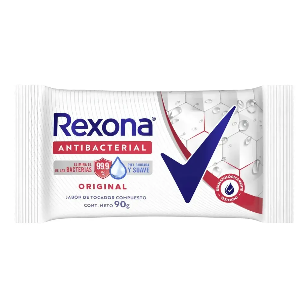 Jabón de tocador antibacterial Rexona Fresh en barra de 90 gramos, formulado para eliminar el 99.9% de las bacterias y proporcionar una limpieza profunda y frescura duradera. Ideal para uso diario en manos y cuerpo, cuidando la piel y previniendo enfermedades.