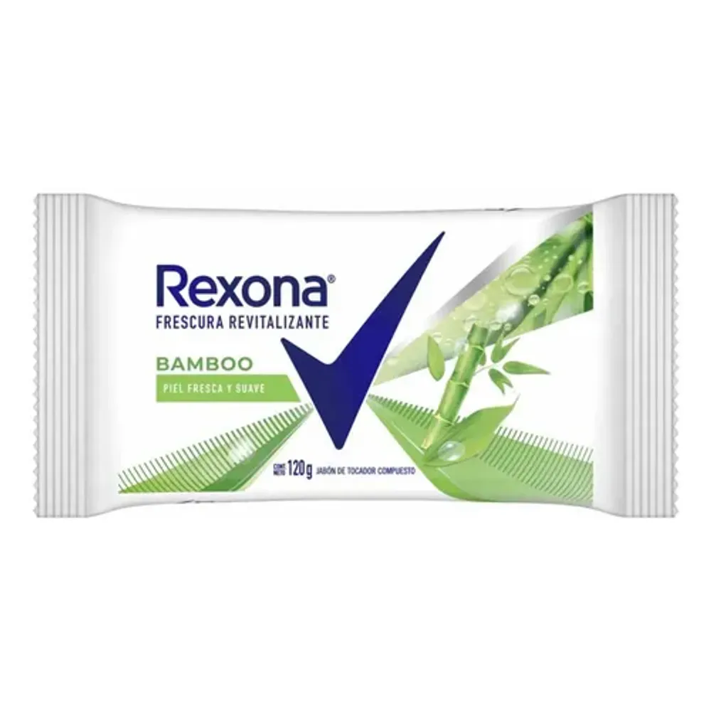 Jabón en barra Rexona con extracto de bambú que proporciona una limpieza refrescante y cuidado hidratante, ideal para pieles sensibles y dedicadas a quienes buscan frescura y suavidad diaria.