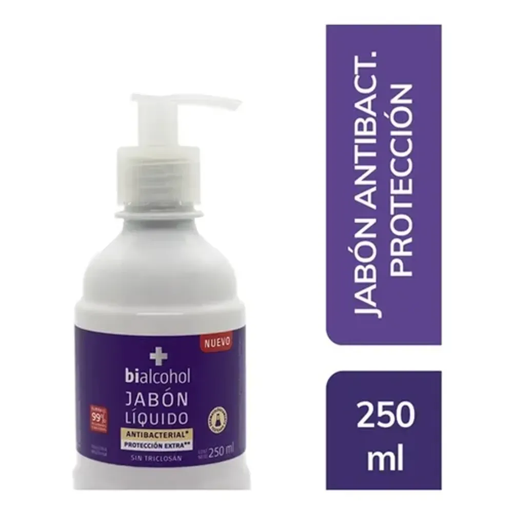 Este jabón líquido antibacterial Bialcohol Extra Protec está formulado para limpiar profundamente y eliminar gérmenes y bacterias de las manos, contribuyendo a mantener una higiene óptima.