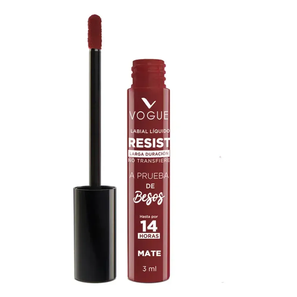 El labial líquido resistente Vogue tono invencible proporciona un color intenso y una fijación duradera que se mantiene intacta durante largas horas, con un acabado mate elegante.