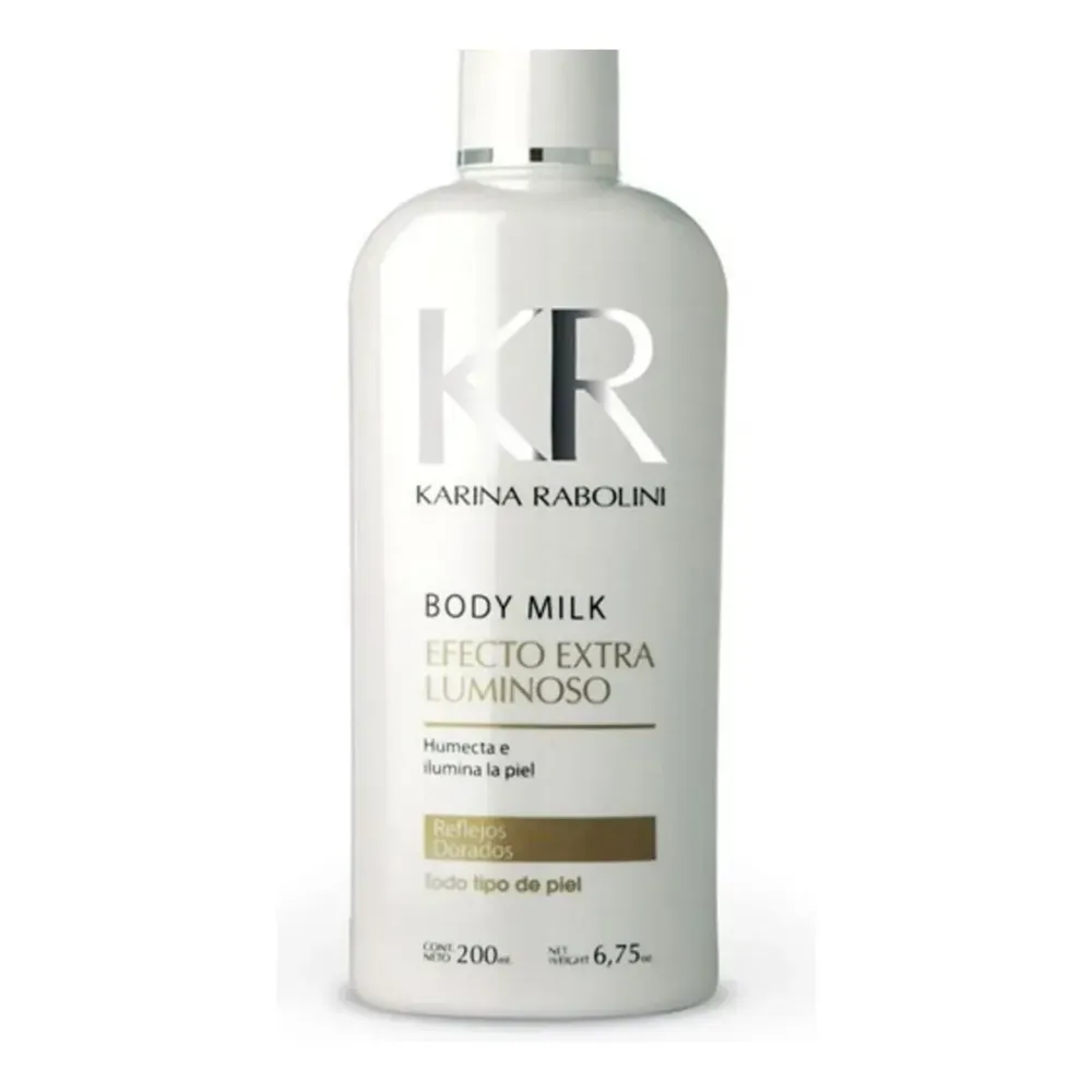Revitalizá tu piel con la exclusiva leche corporal efecto luminoso Karina Rabolini. Su fórmula hidratante con partículas iluminadoras realza el brillo natural de la piel, aportando suavidad inmediata y un aspecto radiante.