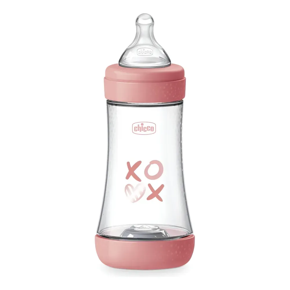 La mamadera Chicco Perfect 5 versión nena está diseñada para seguir el ritmo natural de succión del bebé, con válvula anticólicos y tetina fisiológica para una transición fluida entre pecho y biberón.