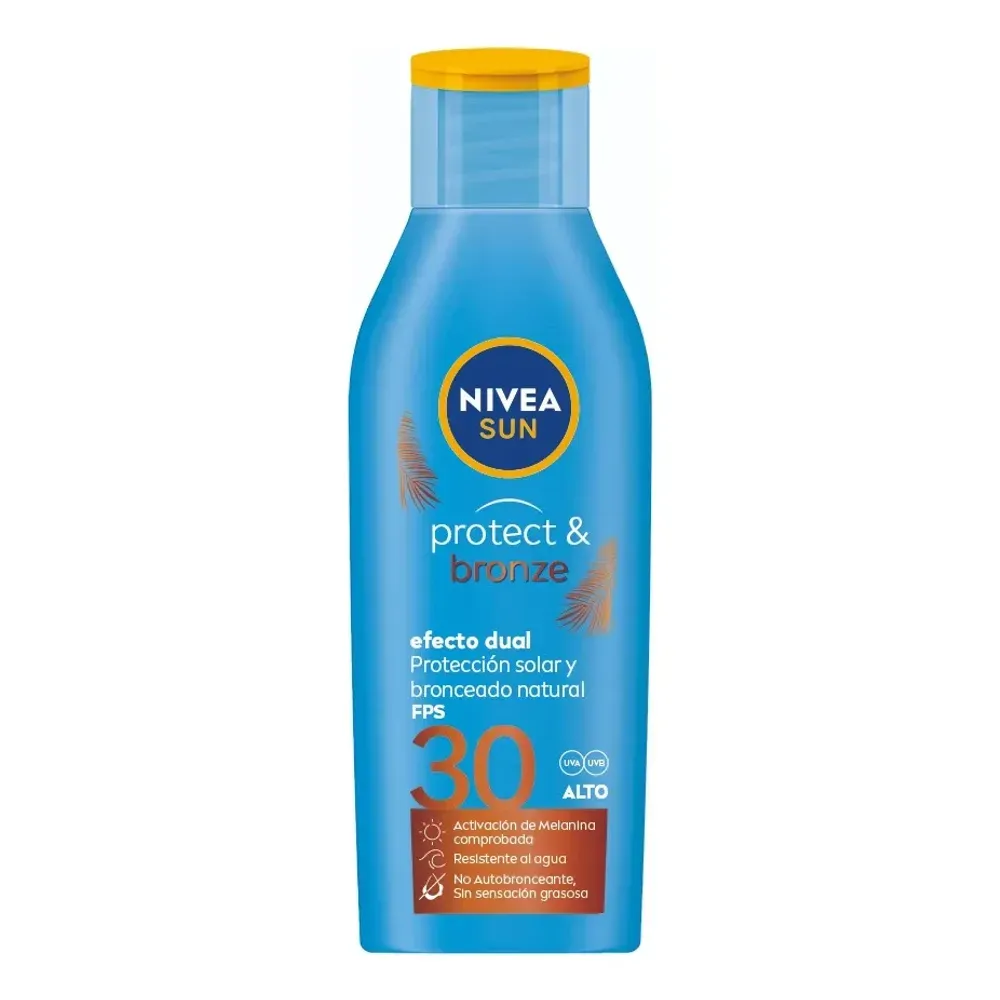 El protector solar NIVEA sun protect & bronze brinda un efecto dual: proporciona un bronceado natural y protege la piel de los efectos dañinos del sol. Su fórmula 82% biodegradable contiene Extracto de Pro-Melanina, ingrediente que aumenta la propia melamina de la piel.