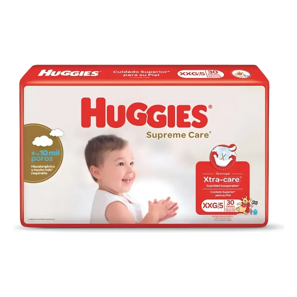 economía $ 2.519,45Los pañales Huggies Supreme Care tamaño extra extra grande ofrecen protección avanzada y comodidad para bebés en etapa de crecimiento y mayor movilidad. Con tecnología de absorción reforzada y ajuste anatómico, mantienen la piel seca por más tiempo y previenen irritaciones.