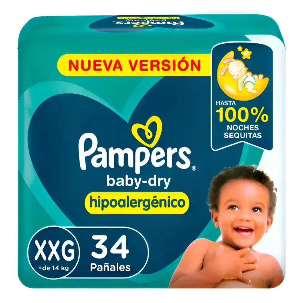 Con tecnología de absorción multicapa, Pampers Baby Dry talla XXG mantiene a tu bebé seco por hasta 12 horas. Su formato extra extra grande brinda comodidad y libertad, acompañando el crecimiento. Barreras laterales reforzadas y ajuste anatómico para máxima seguridad en niños activos.