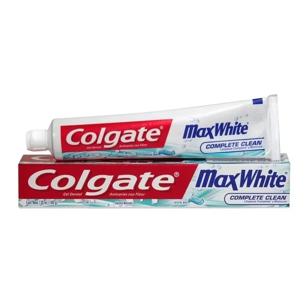 La pasta dental Colgate Max White Complete Clean ofrece una limpieza profunda y blanqueamiento gracias a sus láminas blanqueadoras que eliminan manchas superficiales y protegen el esmalte dental.
