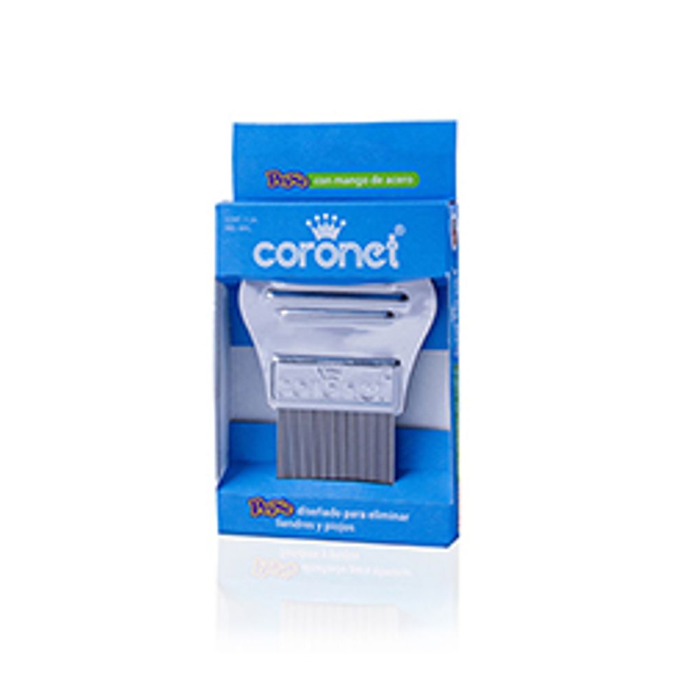 Este peine para piojos Coronet con mango metálico ofrece durabilidad y eficacia en la eliminación de piojos y liendres gracias a sus púas finas y firmes que penetran el cabello para una limpieza profunda.
