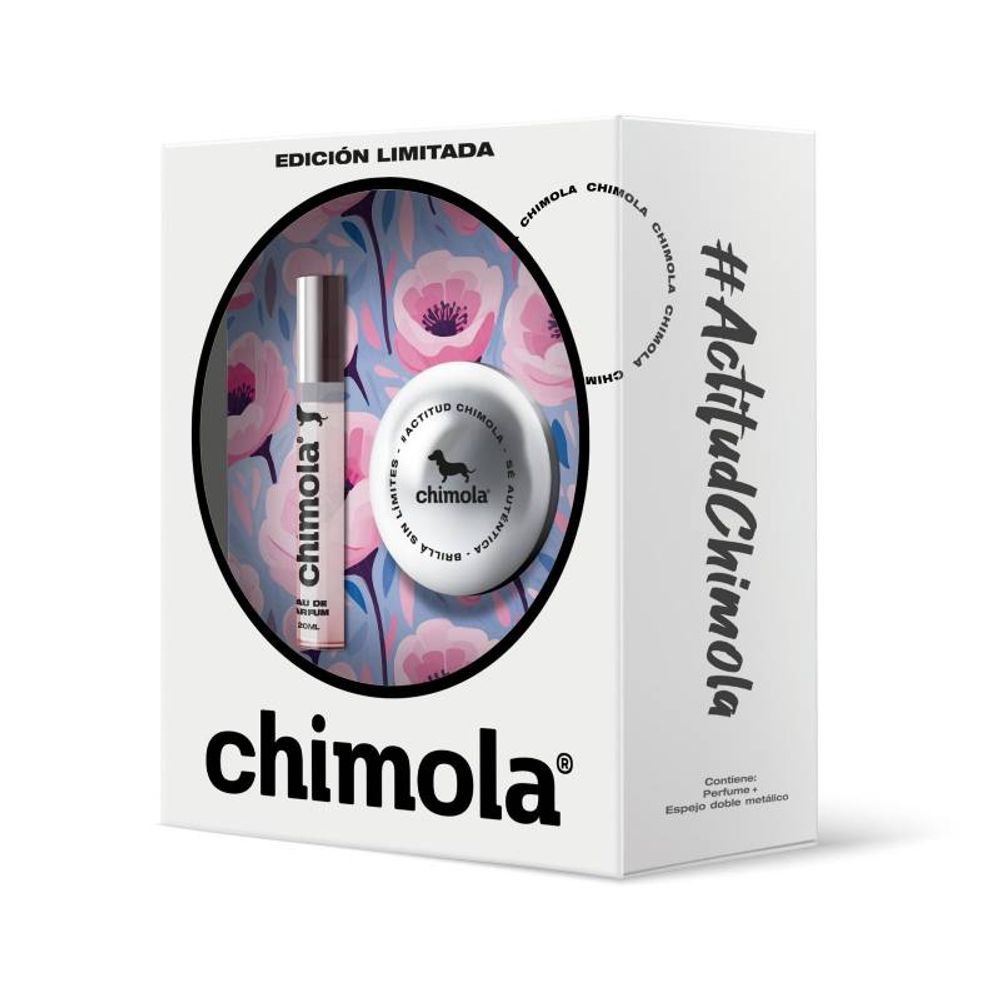 Estuche que incluye perfume de 20 ml y espejo metálico.