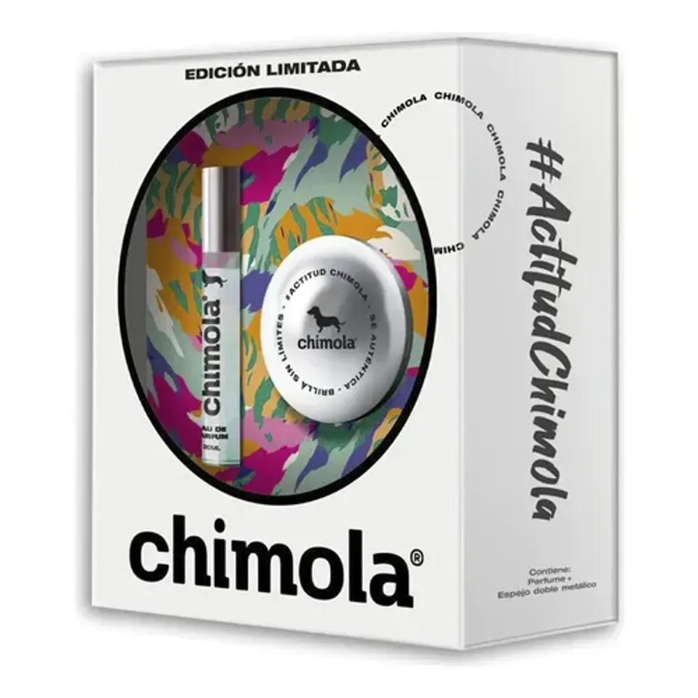 Este set incluye un perfume Chimola Wild en presentación eau de parfum de 20 ml acompañado por un espejo metálico práctico y elegante. Es ideal para quienes buscan una fragancia fresca y floral que acompañe todo el día dejando una estela suave.