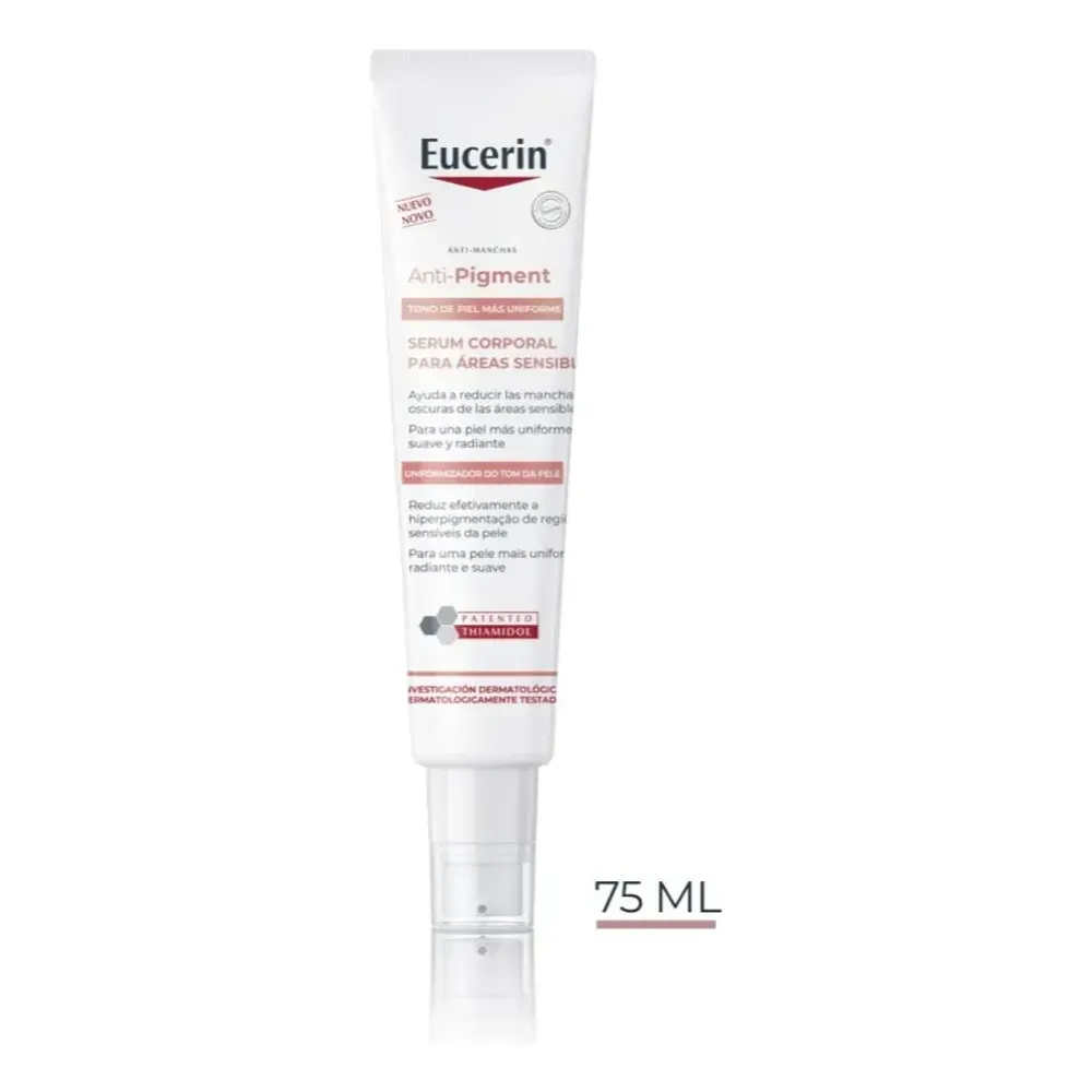 El Sérum Corporal Eucerin Anti-Pigment para Áreas sensibles combina poderosos ingredientes activos que actúan de diversas formas para reducir las manchas, dando así un tono de piel más uniforme y unificado mientras calma la piel sensible. Su fórmula incluye Thiamidol, un ingrediente eficaz y patentado que actúa en la raíz de la hiperpigmentación, ha demostrado clínicamente reducir las manchas y prevenir su reaparición con el uso regular; Licochalcona A, que ayuda a reducir el enrojecimiento y calma la piel; y Ácido Hialurónico, que atrae y retiene la humedad para asegurar que la piel tenga la hidratación necesaria y luzca radiante. Este sérum ha sido probado clínica y dermatológicamente para reducir las manchas de pigmentación, logrando una piel más uniforme y radiante, mientras hidrata durante todo el día para dejarla suave al tacto. Los primeros resultados son visibles después de dos semanas y mejoran continuamente con el uso regular.