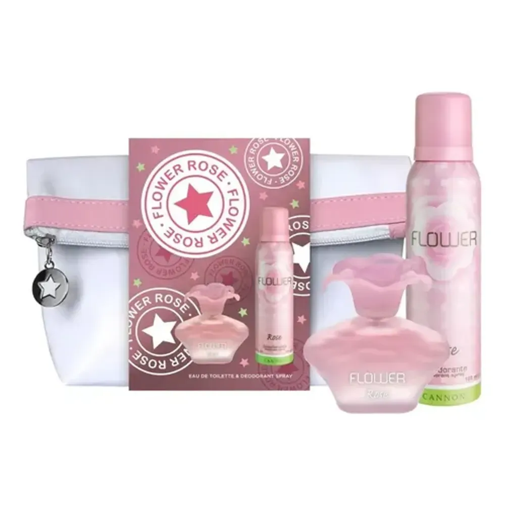El set Flower Rose incluye un eau de toilette de 40 ml y un desodorante de 123 ml, presentados en un neceser elegante. Su aroma combina la delicadeza de las rosas y lilas con la dulzura de las frutas, culminando en un fondo cálido de sándalo y ámbar. Ideal para mujeres que buscan una fragancia femenina y sofisticada.