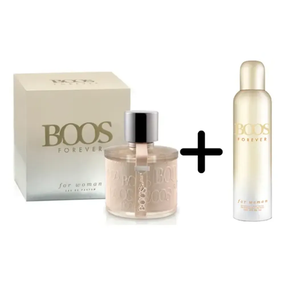 El set Boos Forever Woman ofrece una experiencia olfativa encantadora con su eau de parfum de 100 ml y desodorante de 127 ml. La fragancia combina notas frutales en la salida, un corazón de flor de durazno y un fondo cálido de ámbar y almizcle blanco, ideal para mujeres elegantes y sofisticadas.