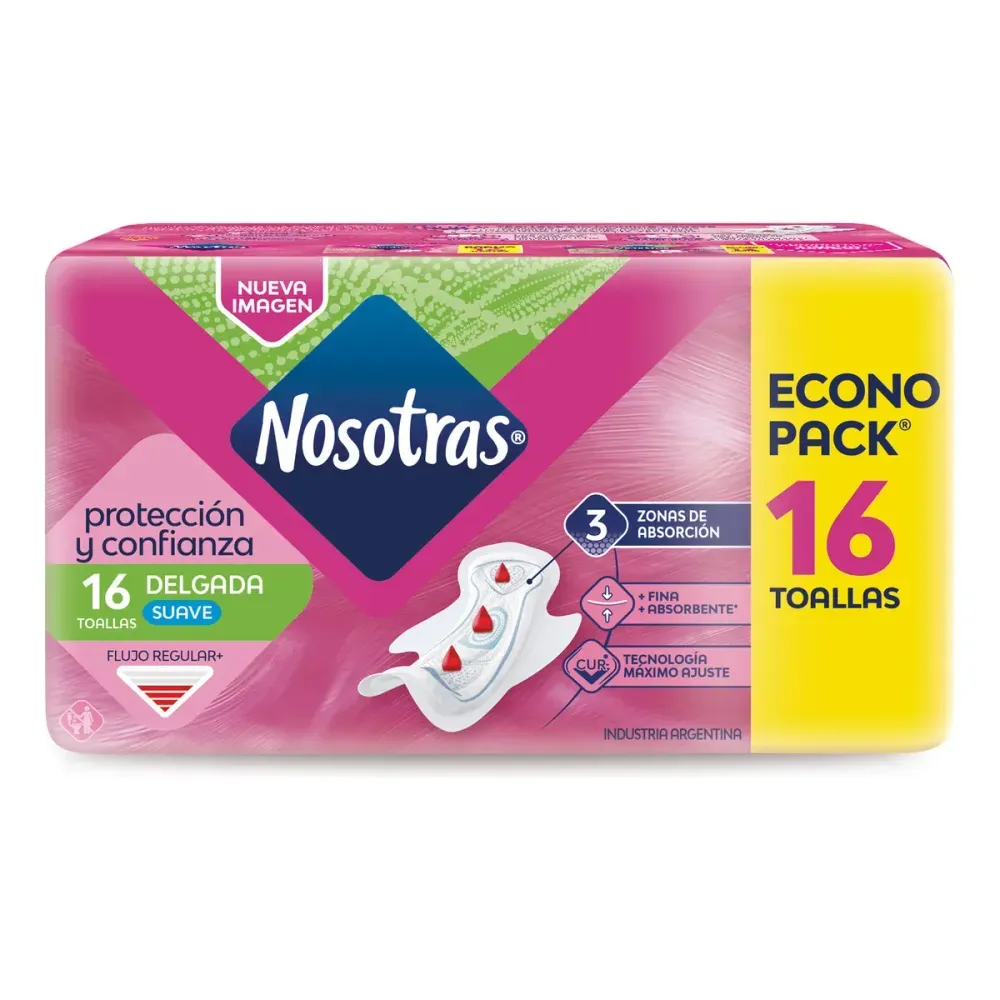 Paquete con 16 toallas femeninas Nosotras delgada suave curva V con alas.