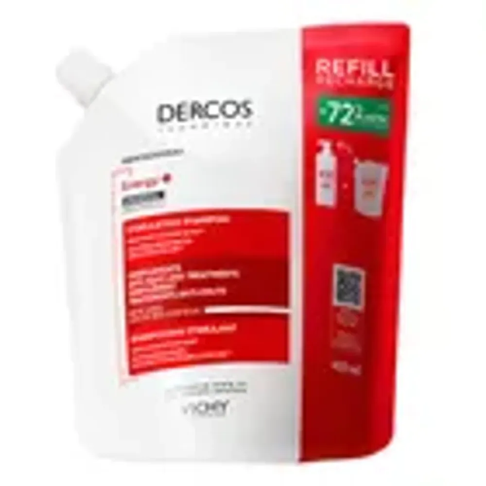 Dercos Energy+ Refill Shampoo Estimulante es el complemento ideal para tratamientos anticaída, formulado para fortalecer el cabello desde la raíz y combatir su debilitamiento. Enriquecido con Aminexil, una molécula de referencia en la lucha contra la caída capilar, este shampoo ayuda a preservar la densidad del cabello y mejorar su resistencia desde el primer uso. Apto para todo tipo de cabello, su fórmula también contiene Niacinamida, un activo que contribuye a regular el sebo y mantener el cuero cabelludo equilibrado. Clínicamente probado, este shampoo muestra resultados visibles desde la primera aplicación. Ahora disponible en un nuevo envase más sustentable, con un -72% de plástico.